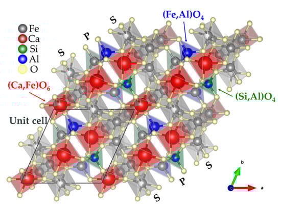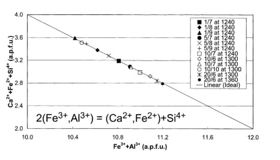 Here, since a unit cell is considered, a decrease in the number of ions on the left side (Fe3+ or Al3+) should be identical to the increase in the number of ions on the right side (Ca2+, Fe2+, or Si4+). This relationship was confirmed by wet chemical analysis, as shown in Figure 8 [62].