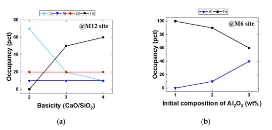 Recently, Park et al. reported the substitution of Zn at the M12 site in SFCA [50]. They used information on Hamilton’s crystal structure parameters to evaluate the atom occupancy variation. Figure 11 shows metallic atom occupancy changes at the M12 site as a function of the basicity and those at the M6 site with respect to the initial composition of Al2O3. As the basicity of SFCA increases, Fe occupancy of the M12 site increases, while Si occupancy decreases. When the Al2O3 concentration increases, the Fe occupancy of the M6 site decreases, while Al occupancy increases.