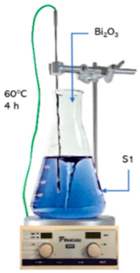Additionally, electrolytes (S2, S3, S4) with increased bismuth content were also prepared for the tests (Figure 1). The procedure for preparation of S2, S3, S4 solutions involves introducing the calculated weight of bismuth(III) oxide into industrial copper electrolyte—S1. Due to very poor solubility, this reagent was added into the electrolyte with 15% excess. After introducing bismuth(III) oxide weight, solutions were heated to 60 °C and intensively stirred for 4 h. After this time, they were cooled, filtered and separated from undissolved residue.