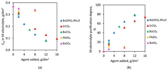 The electrolyte purification degrees were higher with the 8 g/dm3 addition of both barium hydroxide octahydrate and strontium carbonate relative to the 2 g/dm3 additives.