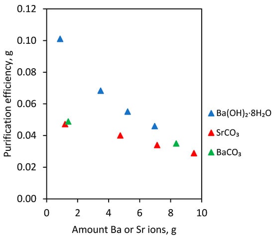 Thus, the electrolyte purifying from Bi contamination depends on the type and amount of removal agent added. In the case of barium hydroxide octahydrate, strontium carbonate and barium carbonate additions, the results with similar values were obtained. In order to better interpret them, the number of grams of Bi removed by 1 g of Ba or Sr ions was calculated. This value was called the “purification efficiency”. The calculated amount of Bi removed in grams per 1 g of Ba or Sr ions (purification efficiency) depending on type and amount of agent added into electrolyte is shown in Table 3 and in Figure 3.