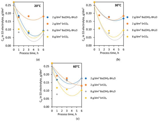 Depending on the temperature, the 2 g/dm3 addition of both agents to the S3 electrolyte resulted in receiving the purification degree in the range of 28.6 to 37.9%. Extending the processing time to 3 and 6 h did not significantly change the values of electrolyte purification degree. The exception was the process carried out at 20 °C with 2 g/dm3 barium hydroxide octahydrate. In that case, the extension of the processing time to 3 and 6 h caused a significant growth of the S3 electrolyte purification degree to 65.7 and 70.6%.
