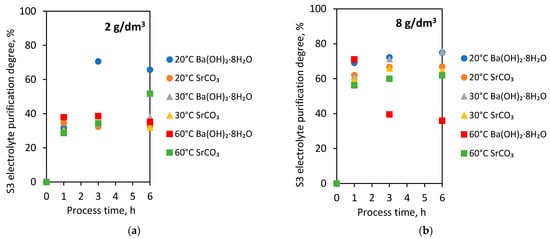 S3 electrolyte purification degree from process time and temperature with the addition of barium hydroxide octahydrate and strontium carbonate in the amounts (a) 2 g/dm3; (b) 8 g/dm3.