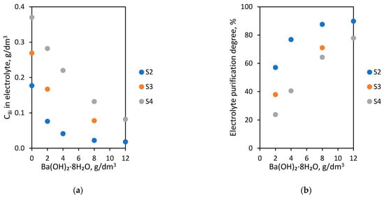 The last laboratory experiments were conducted using S2, S3 and S4 electrolytes. In order to purify them from Bi ions, the various amounts from 2 to 12 g/dm3 barium hydroxide octahydrate were introduced at 60 °C for 1 h. The dependence of Bi concentration in the electrolyte on initial Bi concentration (0.177, 0.269, 0.370 g/dm3) and the amount of barium hydroxide octahydrate added are presented in Figure 6a. The dependence of electrolyte purification degree on initial Bi concentration (0.177, 0.269, 0.370 g/dm3) and amount of barium hydroxide octahydrate added are shown in Figure 6b.