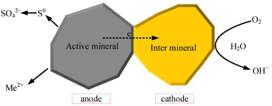 Due to different surface electrostatic potentials, a “galvanic cell” that produces a galvanic effect is formed between the sulfide ores with semiconducting properties when they are in contact during the flotation process [,,]. In the process, the material with the lower electrostatic potential acts as the anode, whose surface oxidizes and dissolves; and the material with the higher electrostatic potential is inert and acts as the cathode, which is to be protected [,,]. Galvanic interaction has a significant impact on the surface properties and mineral floatability. The scheme for the interaction is illustrated in Figure 1 [,]. This interaction may be an important reason for the difficulty in separating pyrrhotite from copper sulfide ore. Xia et al. [] found that the galvanic interaction between copper-activated sphalerite and pyrite affected the adsorption of Cu2+ on the surface of pyrite. This helped sphalerite to preferentially adsorb the Cu and suppress the flotation of pyrite. Nakazawa et al. [] measured the electrostatic potential and galvanic current of pyrite and pyrrhotite mineral electrodes and reported that galvanic electrical contact can improve the floatability of pyrrhotite and reduce pyrite flotation recovery. Through XPS and SEM tests, it was determined that the amount of hydroxide or oxide and iron sulfate on the surface of pyrrhotite decreased when they were in contact with each other, and the amount on the surface of pyrite increased. Miller et al. [] found that the presence of chalcopyrite promoted the oxidation of xanthate on the surface of pyrrhotite, improving its floatability. Kan [] studied the flotation law of binary artificial mixed ore composed of pyrrhotite and galena, sphalerite, chalcopyrite, and brittle sulfur antimonite. The results showed that pyrrhotite and galena, sphalerite, chalcopyrite, and brittle antimony led to galvanic electrical contact between these sulfide ores, with a significant impact on their floatability.