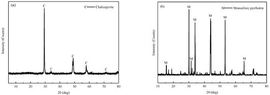 Chalcopyrite used in the experiment was collected from Daye, Hubei; monoclinic pyrrhotite was obtained from Hongqiling, Jilin. They were hand-picked to remove any visible impurities after crushing. The samples were dry-milled using a porcelain ball mill and sieved to obtain a particle size of −0.074 + 0.038 mm, placed in a brown wide-mouth bottle, and stored in a refrigerator for flotation. Detailed descriptions of the mineral samples are presented in Table 1. The purities of chalcopyrite and monoclinic pyrrhotite were 95.30% and 97.70%, respectively. The X-ray diffraction (XRD) spectra are shown in Figure 2. The XRD pattern of monoclinic pyrrhotite showed a double peak of d102 at 2θ = 43.5°, confirming the presence of monoclinic pyrrhotite [].