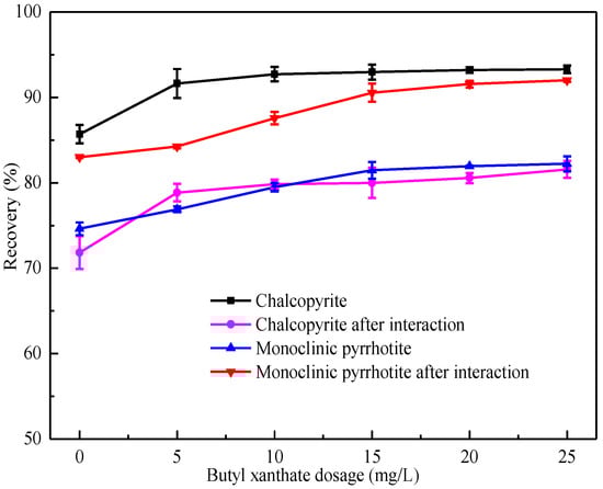 In natural pH conditions (pH = 6.56) and a foaming agent (MIBC) dosage of 15 mg/L, the effect of the dosage of collector butyl xanthate on the flotation behavior of chalcopyrite and monoclinic pyrrhotite before and after galvanic interaction was investigated. The test results are presented in Figure 3.