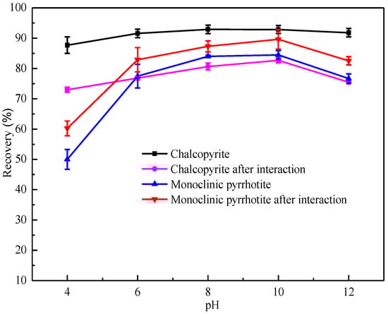 From Figure 4, before galvanic interaction, the floatability of chalcopyrite was better than that of monoclinic pyrrhotite in the investigated pH range; its flotation recovery was generally greater than 90% and less affected by pH. The flotation recovery of monoclinic pyrrhotite first increased and then decreased with an increase in pH; the floatability was best in a weakly alkaline range (pH = 8–10). After galvanic interaction, the flotation recovery of chalcopyrite decreased by 10%–16%, and the recovery of monoclinic pyrrhotite increased by 3%–10%, as shown in Figure 4. When the pH was higher than 5, the recovery of monoclinic pyrrhotite was better than that of chalcopyrite, possibly because a neutral to alkaline solution is more conducive to formation of hydrophilic substances such as Fe(OH)3 on the chalcopyrite surface. The galvanic interaction significantly reduced the difference in floatability between the two minerals; at pH = 12, the difference in flotation recovery between the two was reduced from 15.15% before interaction to 7.09%. When pH = 4, the maximum difference was seen.