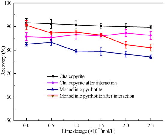 Figure 5 shows that lime had no inhibitory effect on chalcopyrite but had a certain inhibitory effect on monoclinic pyrrhotite. The floatability of monoclinic pyrrhotite before and after galvanic interaction tended to decrease with an increase in lime consumption; the recovery decreased by 5% and 10%, respectively. Consistent with the laws shown in Figure 3 and Figure 4, the galvanic interaction between the two minerals reduced the recovery of chalcopyrite by 3%–6%; the recovery of monoclinic pyrrhotite increased by 4%–8%. When the lime dosage was low, the difference in floatability was small. The difference between the flotation recovery of the two minerals did not reach the maximum until the lime dosage increased to 2.5 × 10−3 mol/L, the difference before galvanic interaction was 12.56%, and the value after galvanic interaction was reduced to 5.17%. It was difficult to separate chalcopyrite and monoclinic pyrrhotite after galvanic interaction even with a large amount of lime.