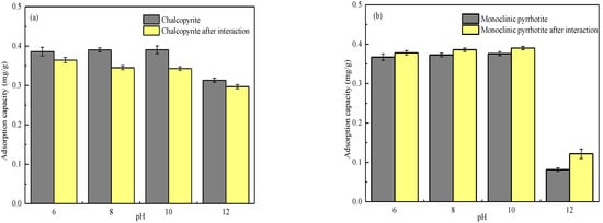 It is observed in Figure 6a that in the investigated pH range, the change in trend of the adsorption dosage of butyl xanthate on the surface of chalcopyrite was the same before and after galvanic interaction, with a trend of first increasing and then decreasing, with a peak in the pH range of 8–10. After galvanic interaction, the adsorption of butyl xanthate by chalcopyrite decreased over the entire pH range, and the adsorption of butyl xanthate by monoclinic pyrrhotite increased slightly (Figure 6b), which was consistent with the flotation test results.