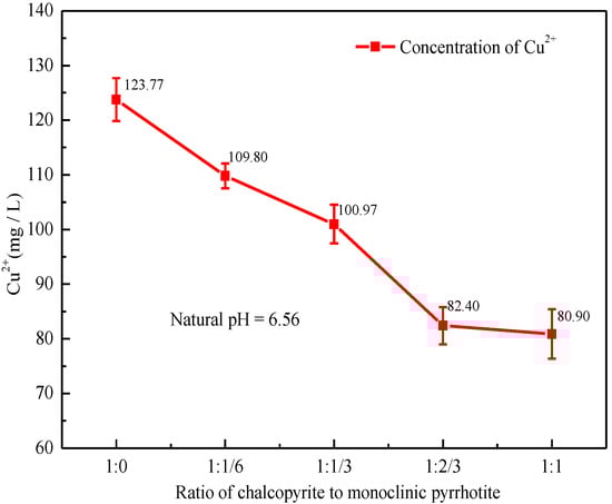 Figure 7 shows that without monoclinic pyrrhotite, a large amount of Cu2+ (123.77 mg/L) was dissolved from chalcopyrite surface. The addition of monoclinic pyrrhotite inhibited the dissolution of Cu2+ from the chalcopyrite surface to some extent. With an increase in monoclinic pyrrhotite content, the inhibitory effect became more obvious. This may be due to the galvanic interaction between chalcopyrite and monoclinic pyrrhotite. Chalcopyrite was protected as a cathode, which slightly weakened its surface dissolution. However, the interaction between the two minerals cannot completely inhibit the dissolution of Cu2+ from the chalcopyrite surface. When the mass ratio of the two minerals was 1:1, the Cu2+ concentration in the slurry solution was still as high as 80.90 mg/L.