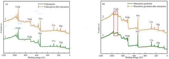 To reveal the influence mechanism of the galvanic interaction between chalcopyrite and monoclinic pyrrhotite on their surface properties, XPS tests were conducted on the surface of chalcopyrite and monoclinic pyrrhotite before and after galvanic interaction. The full-spectrum scan spectra of chalcopyrite and monoclinic pyrrhotite are shown in Figure 8a,b. The changes in the surface element concentration and atomic ratio of chalcopyrite and monoclinic pyrrhotite before and after galvanic interaction were investigated; the results are shown in Table 2