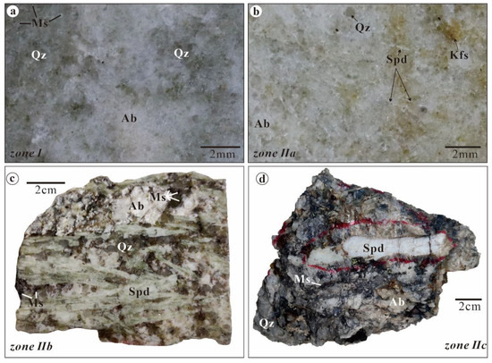 (a–d) Photographs of the different lithologies observed in hand specimens. (a) Partial view of a hand specimen from the barren zone (Zone I), showing a very fine-grained structure and containing abundant muscovite, quartz and albite. (b) Partial view of a hand specimen of microcrystalline spodumene + fined-grained albite pegmatite (Zone IIa), where spodumene forms short to elongate laths, mostly ranging from 0.1 to 0.2 mm. (c) Hand specimen of fine-grained spodumene + albite pegmatite (Zone IIb) with abundant spodumene prisms ranging from 2 to 4 cm. (d) Hand specimen of coarse-grained spodumene + quartz + albite aggregates (Zone IIc) containing 10-centimeter-scale spodumene crystals. Abbreviations: Ab: albite, Kfs: K-feldspar, Ms: muscovite, Qz: quartz, Spd: spodumene.