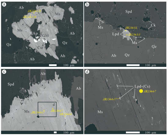 For each subzone of Zone II, small flakes of mica may occur discontinuously along the edge of spodumene grains (Figure 5b), indicating a secondary origin. Li-mica is rare but is present in every textural zone of Zone II, though it only occurs as alteration product of primary muscovite. In Zone IIa, Li-mica may occur as discontinuous rims of muscovite which contacts spodumene (Figure 5b); in Zone IIb, it occurs as rims of muscovite set in fractures of spodumene (e.g., Zone IIb). Notably, in Zone IIc, groups of micrometer-scale flakes of Cs-rich mica may appear along the cleavage planes of the primary muscovite grains (Figure 5c,d), the highest Cs2O content of which can reach 16.8 wt.% (Supplementary Table S2).