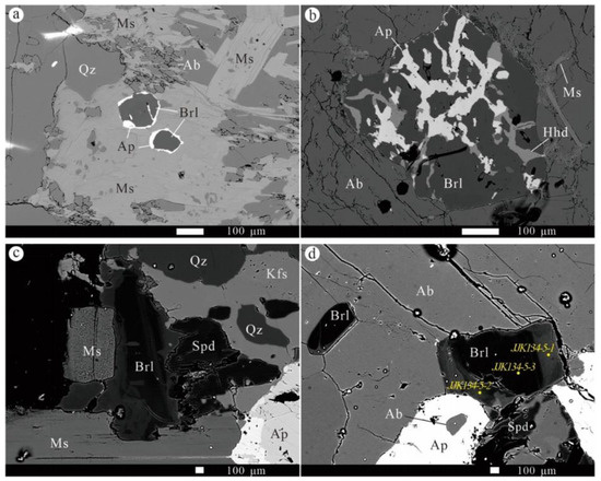 Beryl is the only primary Be-bearing mineral in the No. 134 pegmatite. Beryl crystals are ubiquitous in Zone I but rarely present in other zones; a few were observed in samples from Zone IIa and Zone IIb. In Zone I, beryl grains are usually discretely distributed in muscovite and albite (Figure 6a,b). Hydroxylapatite often occurs as a secondary phosphate residing within the fractures or coating the rim of beryl crystals (Figure 6a). Hydroxylherderite is immersed within these crosscutting veinlets (Figure 6b). In Zones IIa and IIb, beryl grains are often associated with spodumene and muscovite (e.g., Figure 6c,d). Beryl in Zone II commonly shows compositional heterogeneity, as it may display alterations on the rim or form patchy zonation (Figure 6c,d), while beryl in Zone I is mostly homogeneous and, in a few cases, very weakly zoned.