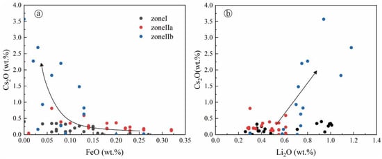 Chemical variation of (a) Cs2O vs. FeO and (b) Cs2O vs. Li2O in beryl from each zone of the Jiajika No. 134 pegmatite.
