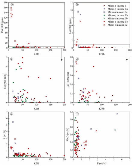 Plots of (a,c) Cs vs. K/Rb, (b,d) Li vs. K/Rb, (e) F vs. K/Rb and (f) Rb2O vs. F in micas from each zone of the Jiajika No. 134 pegmatite. Micas-p, primary micas; Micas-s, secondary micas.
