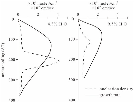 Nucleation densities and growth rates as a function of undercooling (ΔT) in an alkali feldspar melt, according to Fenn [74] and Nabelek et al. [36].