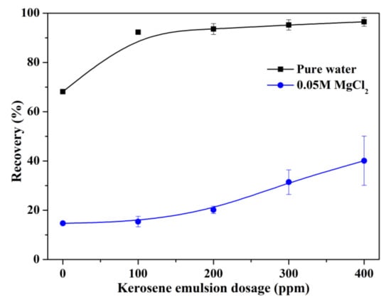 Figure 1 shows the effect of kerosene emulsion on chalcopyrite flotation recovery with and without 0.05 M MgCl2 solution at pH 10. In pure water, a flotation recovery of 68.1% was obtained in the absence of kerosene emulsion, indicating a good natural floatability of chalcopyrite [9]. An increment of approximately 24% to approximately 90% for chalcopyrite recovery was found when 200 ppm kerosene emulsion was added. However, an insignificant increase was found with further addition of kerosene emulsion up to 400 ppm. A recovery of 14.8% was obtained in 0.05 M MgCl2 in the absence of kerosene, indicating that the presence of Mg2+ significantly inhibited chalcopyrite flotation under an alkaline condition (i.e., pH = 10), consistent with previous studies [6,12,13]. Differently, chalcopyrite flotation recovery increased gradually from 15.4% to 40% with increasing kerosene emulsion dosage from 100 to 400 ppm, suggesting the beneficial role of kerosene emulsion.