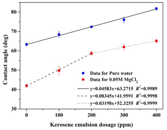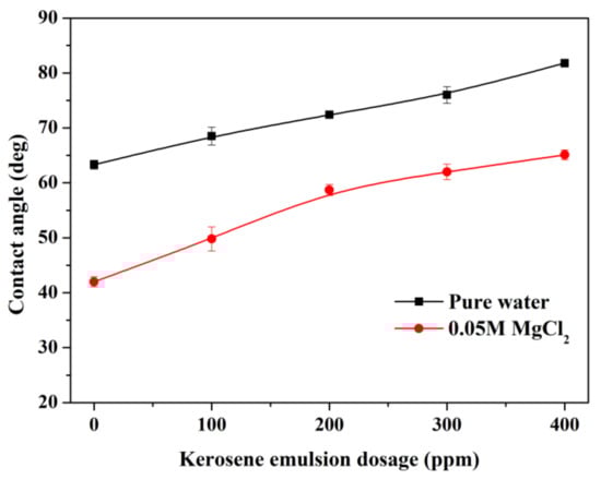 Contact angles of the chalcopyrite’s surface in pure water and 0.05 M MgCl2 solution at pH 10, as a function of kerosene emulsion dosage.