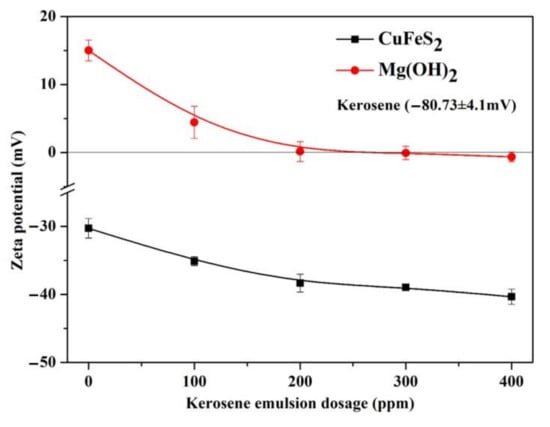 Figure 7 shows the zeta potentials of the chalcopyrite particles and Mg(OH)2 precipitates in the presence of kerosene emulsion in pure water at pH 10. A zeta potential of −30.27 mV and −80.73 mV was found for chalcopyrite particles and kerosene, respectively, indicating that both the chalcopyrite’s surface and kerosene were negatively charged. With increasing kerosene concentration from 100 to 400 ppm, the zeta potential of chalcopyrite in pure water decreased linearly; e.g., from −35.1 mV to −40.3 mV, possibly due to the adsorption of more negatively charged kerosene onto the chalcopyrite’s surface [17].