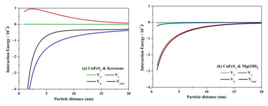 As discussed above, chalcopyrite flotation behaviors herein were strongly connected with Mg(OH)2 precipitates and kerosene emulsion, which usually can be explained by the interaction between particles [6,13,35]. Therefore, the interaction energies of Vw, Ve, and Vh and Vtotal among chalcopyrite, kerosene, and Mg(OH)2 were calculated, and are presented in Figure 8.