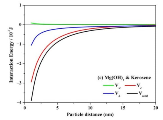 Figure 8c shows the interaction force between Mg(OH)2 and kerosene. The Vw showed a positive value, while the Ve and Vh presented negative values, eventually giving rise to a negative Vtotal. Specifically, the absolute value of Ve was significantly greater than that of Vh, indicating that the negative Ve played a dominant role in Vtotal between Mg(OH)2 and kerosene. Thus, these two compounds were easily attached to each other, forming kerosene–Mg(OH)2 aggregates.