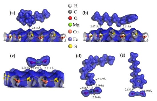 Figure 9 shows the electron density of the main components of the kerosene emulsion or Mg(OH)2 molecule adsorbed onto the chalcopyrite (112) surface, in addition to the main components of the kerosene emulsion onto the Mg(OH)2. No new bonds were formed on the chalcopyrite (112) surface for straight-chain paraffin/aromatic hydrocarbons (Figure 9a,b), indicating that no chemical reactions occurred between the kerosene emulsion and the chalcopyrite’s surface. In other words, the kerosene emulsion was physically adsorbed onto the chalcopyrite (112) surface, and the hydrophobicity of the chalcopyrite enhanced by kerosene was due to the physical adsorption of kerosene [48]. Furthermore, the closest distances between chalcopyrite and kerosene, chalcopyrite and Mg(OH)2, and Mg(OH)2 and kerosene were 2.614 Å, 2.758 Å, and 2.599/2.550 Å, respectively, showing an distance order of Mg(OH)2 and kerosene > chalcopyrite and kerosene > chalcopyrite and Mg(OH)2. This further suggested that kerosene was more readily adsorbed with Mg(OH)2 colloids. In contrast, the weakest adsorption occurred between chalcopyrite and Mg(OH)2.