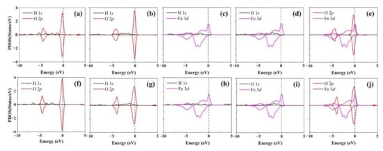 PDOS analysis of: (a,f) straight-chain aromatic hydrocarbon and Mg(OH)2; (b,g) straight-chain paraffin and Mg(OH)2; (c,h) straight-chain aromatic hydrocarbon and chalcopyrite; (d,i) straight-chain paraffin and chalcopyrite; (e,j) chalcopyrite and& Mg(OH)2. (a–e) Before adsorption; (f,j) after adsorption.