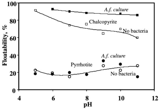 Floatability of chalcopyrite and pyrrhotite in the presence of a collector with (solid symbols) and without bio-modification (open symbols). Adapted from Pecina-Treviño et al. [9].