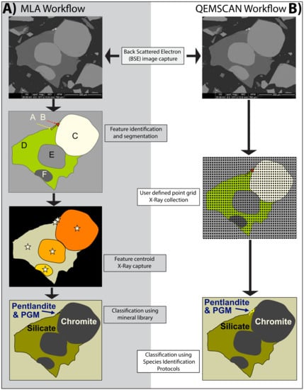 Example of sample workflow for automated mineralogy for (A) mineral liberation analysis (MLA) and (B) QEMSCAN™. Modified from Layton-Matthews et al., 2014 [72].