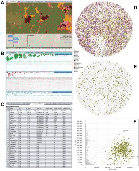 Examples of μ-EDXRF AMICS data exploration. (A) False-coloured sample image classified using the M4 Tornado MineralSTDManager software [108]. (B) Size and mineralogy (olivine, garnet and plagioclase) sorted Particle Grid [58]. (C) Sorted calculation table including wt%, Area%, and Particle Numbers [108]. (D) False-coloured sample image of 2.5 cm epoxy mount. (E) False-coloured sample image of 2.5 cm epoxy mount filtered for chalcopyrite (olive green). (F) Bivariate plot of S (ppm) vs. Cu (ppm) filtered by Cu > 150,000 ppm in ioGAS™ [115] to identify chalcopyrite grains of interest. Note images D, E, and F supplied by Portable Spectral Services (PSS) (Pers. Comm., N. Brand 2021).