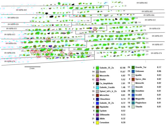 MLA-SEM image of gahnite grain mount 10-0269-P01 for Izok Lake samples. Adhering gangue mineral compositions are indicated with various colours outlined in the legend. Till sample numbers are listed on the outer sides of the image and grain position numbers on the mount are listed at the end of each row. Red circles indicate those grains for which the LA-ICP-MS/EPMA mineral chemistry is anomalous (Hicken, 2012 [165]).