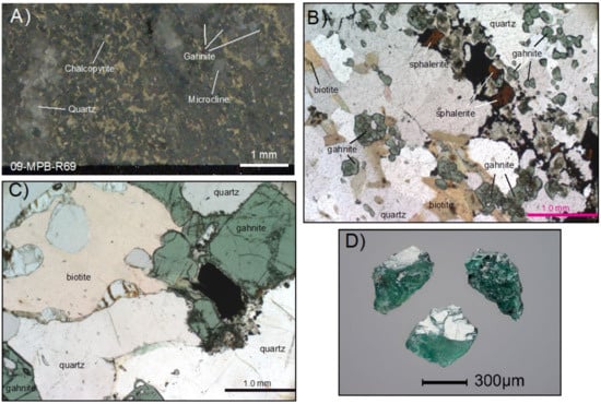 Gahnite grains in bedrock and till samples from Izok Lake: (A) polished slab of drill core (sample 09-MPB-R69); (B,C) polished thin sections (sample 09-MPB-R37 and 09-MPB-R41B, respectively); (D) grains from heavy mineral concentrate of till sample 12-MPB-913 (photograph by M.J. Bainbridge Photography). Modified from Hicken (2012) [165].