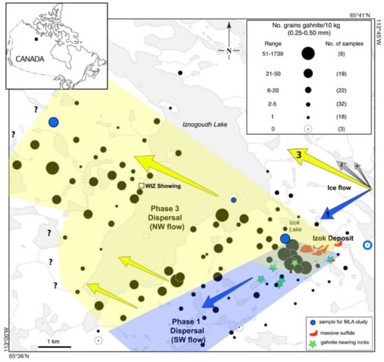 Fan-shaped glacial dispersal of gahnite abundance in the 0.25–0.5 mm fraction of till (normalized to a 10 kg) down-ice of the Izok Lake volcanogenic massive sulphide deposit in northern Canada. The fan formed by two phases of ice flow towards the southwest (blue polygon) and northwest (yellow polygon). Arrows indicate relative ice-flow chronology (1 = oldest) and vigor (arrow size) of flow events. Blue dots indicate the four till samples for which the <0.25 mm heavy mineral fraction was examined using MLA. Modified from McClenaghan et al. (2015 [24]). Location of mineralization indicated by solid red polygons and additional gahnite-bearing rocks by green stars.