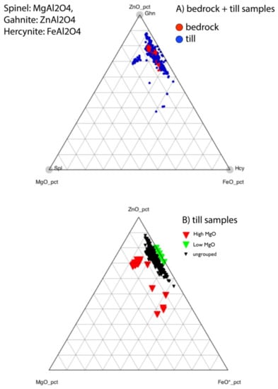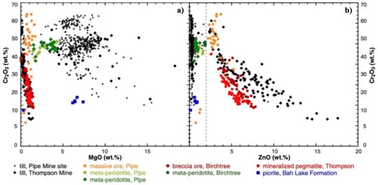 (a) Cr2O3 versus MgO and (b) Cr2O3 versus ZnO concentrations in chromian spinels from bedrock and till samples from the Thompson Ni Belt: mineralized bedrock (orange and red symbols), unmineralized bedrock (blue and green symbols), and till samples (black symbols). Dashed vertical line indicates 2 wt % ZnO. Modified from McClenaghan et al. (2013) [42].
