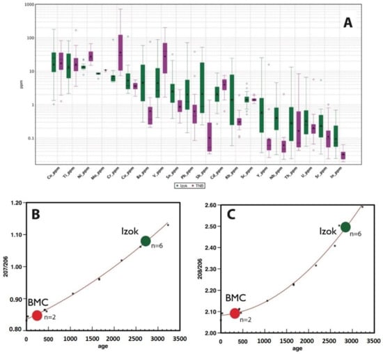(A) Box and Whisker plot of LA-ICP-MS quadrupole trace element data for gahnite from tills from the Izok Lake VMS and the Thompson Ni-Cu PGE deposits areas. (B) LA-ICP-MS 207Pb/206Pb age relations for Izok Lake VMS (green circles) and Halfmile Lake VMS (Bathurst Mining Camp, New Brunswick: red circles). (C) LA-ICP-MS 208Pb/206Pb age relations for Izok Lake VMS (green circles) and Halfmile Lake VMS (Bathurst Mining Camp, New Brunswick: red circles). Red lines are an approximation of terrestrial lead isotopic evolution (Stacey and Kramers 1975) [169]. High-precision U/Pb ages for Halfmile Lake is 465 Ma (van Staal et al. 2003) [170], for is Izok Lake is 2623 ± 20 Ma (Mortensen et al. 1988) [168] and 2680.5 +7/−3 Ma (J. Gebert, unpub. 1995).