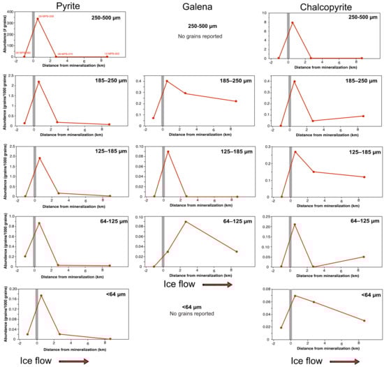 Lines plots comparing the abundance of pyrite, galena, and chalcopyrite grains in 5 different size fractions of heavy mineral concentrates (HMC) from till samples up and down ice of the Izok Lake VMS deposit. Location of mineralization is indicated by grey vertical line in each plot. Uppermost plots (250–500 µm) represent grain abundance/10 kg determined by visual inspection of the HMC. Lower 4 plots (<250 µm fractions) represent grains abundance/1000 grains determined by MLA. Modified from Lougheed et al. (2020) [27].
