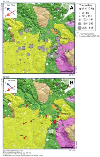 (A) Distribution of 0.25–0.5 mm tourmaline in the 2.8–3.2 specific gravity fraction of till samples down ice of the Woodjam porphyry Cu-Au deposits, counts normalized to 10 kg. White dots indicate samples for which the tourmaline grains were analyzed by MLA. (B) Percentage of tourmaline grains that were analyzed and that were identified as ‘porphyry-derived’ based on high concentrations of Sr, low concentrations of Zn and Pb, and their lack of inclusions. Bedrock geology from Logan et al. (2010) [181] and Plouffe and Ferbey (2017) [58]. Modified from Beckett-Brown et al. (2021) [61].