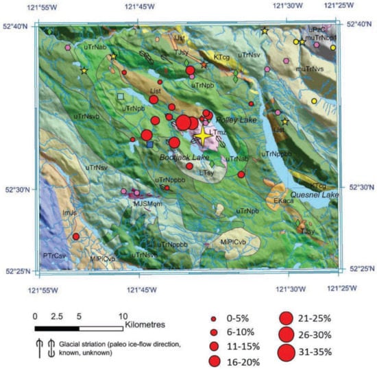 Percentage of magnetite grains that were identified as ‘hydrothermal porphyry’ based on the Ti-Ni/Cr discrimination diagram of Dare et al. (2014) [118] in 20 till samples around the Mount Polley Cu-Au deposit. Symbol size is proportional to percentage of total number of magnetite grain analyzed. Deposit location indicated by yellow star. Bedrock geology from Logan et al. (2010) and Plouffe and Ferbey (2017) [58]. Modified from Pisiak et al. (2017) [57].