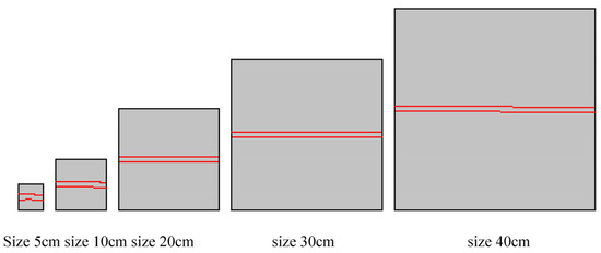 In rocks, the angle of parallel joints cannot always be 0°. In order to verify the universality of the formulas obtained, we established two sets of numerical simulation schemes with an angle of 45° as the comparison group, based on the original numerical simulation schemes. Each simulation program included 5 groups of working conditions. When the rock size was 100 mm, the working conditions with the NPJs of 2, 4, 6, 8, and 10 were set, as shown in Table 2. When the NPJ is 2, the rock sizes of 50, 100, 200, 300, and 400 mm were set, as shown in Table 3.