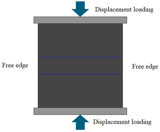 The theoretical basis of the simulation was the rock uniaxial compression deformation theory. The mechanical model of the simulation test was a plane stress model, and the constraint condition was that the two sides of the model are free surfaces without force, and the upper surfaces of the model bear the load. The adopted loading method was displacement loading on both sides of the model. Numerical simulation adopted the displacement loading method. The displacement on both sides of the model was 0 mm, and the displacement on the upper and lower surfaces of the model was 0.01 mm. The loading method and boundary control are shown in Figure 3.