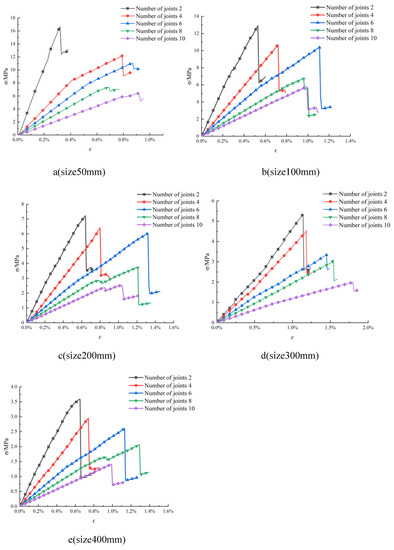 Equation (6) is the formula when the specific parallel joint angle is 0. When the parallel joint angle changes, in order to verify the general applicability of Formula (6), a set of comparative numerical simulation schemes with the parallel joint angle of 45° was added deliberately in the study. According to the numerical simulation results, the stress–strain curves of different sizes of rocks were drawn, as shown in Figure 17.