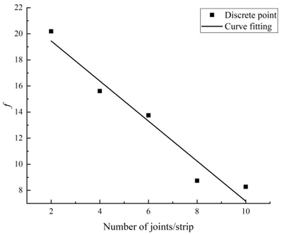 According to the stress–strain curve in Figure 15, the UCS of the rock under each working condition is solved when the parallel joint angle is 45°. At the same time, in order to facilitate data comparison and analysis, the data values of different NPJs with a rock size of 100 mm in Table 5 were extracted, and they are shown in Table 13. According to the data in Table 13, a scatter plot of the UCS and the NPJs were drawn, and their fitting curves were drawn, as shown in Figure 16.