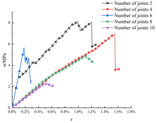 Considering that the curves followed the same law, only one of the graphs was selected as an example. The curve with two joints in Figure 4a was selected to analyze the stress–strain law. Figure 4a shows that the stress increases linearly with the increase in strain, and the model is in the elastic compaction stage. When the stress increases to 16.644 MPa, the linear change ends, and the curve value suddenly decreases to 12.412 MPa. Then, as the strain increases, the stress fluctuates around 12.412 MPa. This shows that the failure process of the rock begins with elastic deformation and ends with brittle failure. Although there is still a period of fluctuation after failure, the rock has generally failed.
