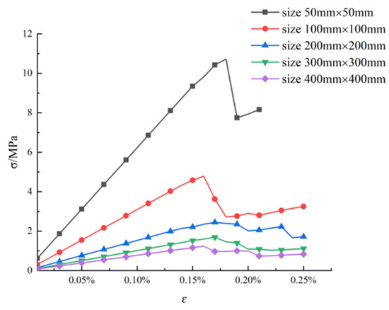 For each simulation program of the second research focus, the numerical simulation results under each working condition were output, and the stress–strain curve was drawn; the same coordinate system was used for all curves. Summary diagrams of the stress–strain curves considering different rock sizes for each simulation program were obtained, as shown in Figure 8.