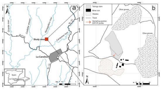 This study is located in the metallogenetic district of Linares–La Carolina (southeastern Spain) (Figure 1a), known for the existence of important mineralizations of Pb-Ag sulpho-antimonides and Cu-Fe sulphides that have been exploited since the pre-Roman period up to the 1980s. This lengthy period of mining activity has left numerous wastes on the ground from both the extractive activity and the concentration and smelting processes. Environmentally, these wastes are potentially dangerous and have been deposited in sites lacking any previous adaptation or remediation after abandonment, given that, at that time, environmental regulations were very lax [,,,,].