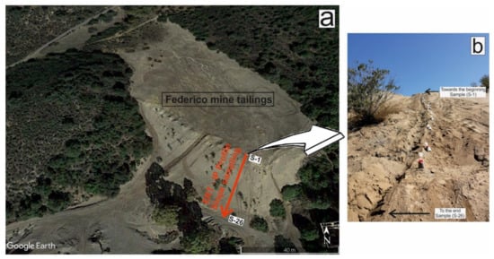 An old dam of flotation wastes from the Federico Mine was selected, located in the drainage basin of the Grande River (Figure 1a,b), whose waters feed the Rumblar reservoir, intended for human consumption and irrigation []. In this same watershed, 10 other structures contain the same type of mining waste. In total, 33 tailings dams and ponds have been inventoried in the Linares—La Carolina mining district, with a volume of 10,500,000 m3 of waste []. In addition, at that time, the concentration processes were not efficient due to technical limitations, which means that these mining liabilities present a high metal(oid) content [].