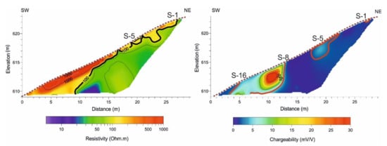 The geoelectric resistivity and chargeability profiles obtained along the slope of the tailings dam are represented in Figure 3 (modified from []). The objective of this geoelectric profile was to obtain an actual resistivity image to verify, as a function of the lateral electrical response obtained, whether the deposited waste was uniform in composition or, on the contrary, if metal(oid)-enriched zones could be differentiated.
