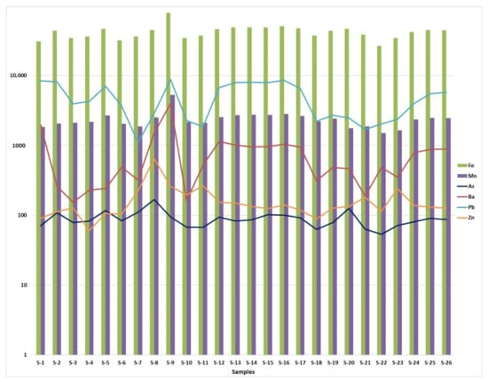 The values of the contents of As, Fe, and Mn present a normal distribution. The same does not happen in the case of Ba, Pb, and Zn, which present a lognormal distribution (Figure 5c). In addition, Ba and Zn present a distribution of values very far from normal due to Samples S-8 and S-9.